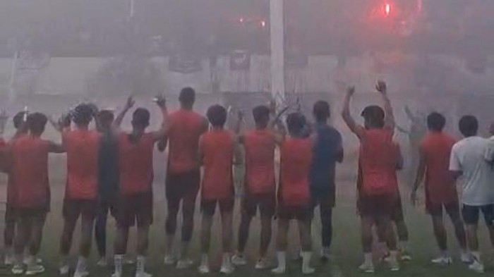 Di sisi lain, pemain staf dan pelatih terlihat berbaris panjang menyaksikan aksi suporter. Kemudian mereka menyambangi suporter dan menyampaikan terima kasih.